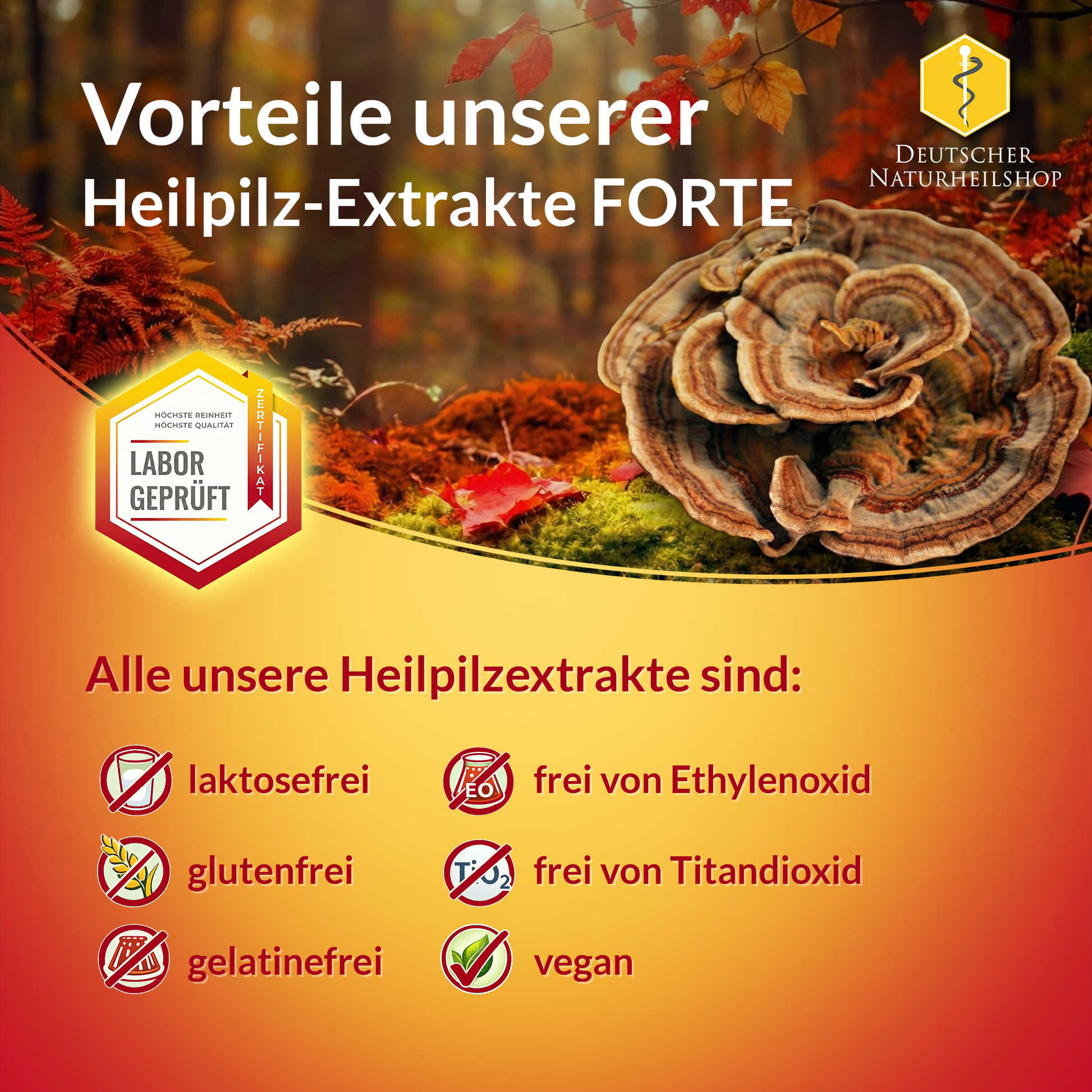Die FORTE-Version unseres Reishi Pilz Extrakts bietet eine hochkonzentrierte Darreichungsform des geschätzten Heilpilzes für höchste Ansprüch mit 30% Polysaccharide pro Kapsel – die doppelte Konzentration der grünen Standardversion. Diese komplexen Kohlenhydratverbindungen sind charakteristisch für die biologische Aktivität von Vitalpilzen und machen sie zu geschätzten Naturprodukten in der Mykotherapie.