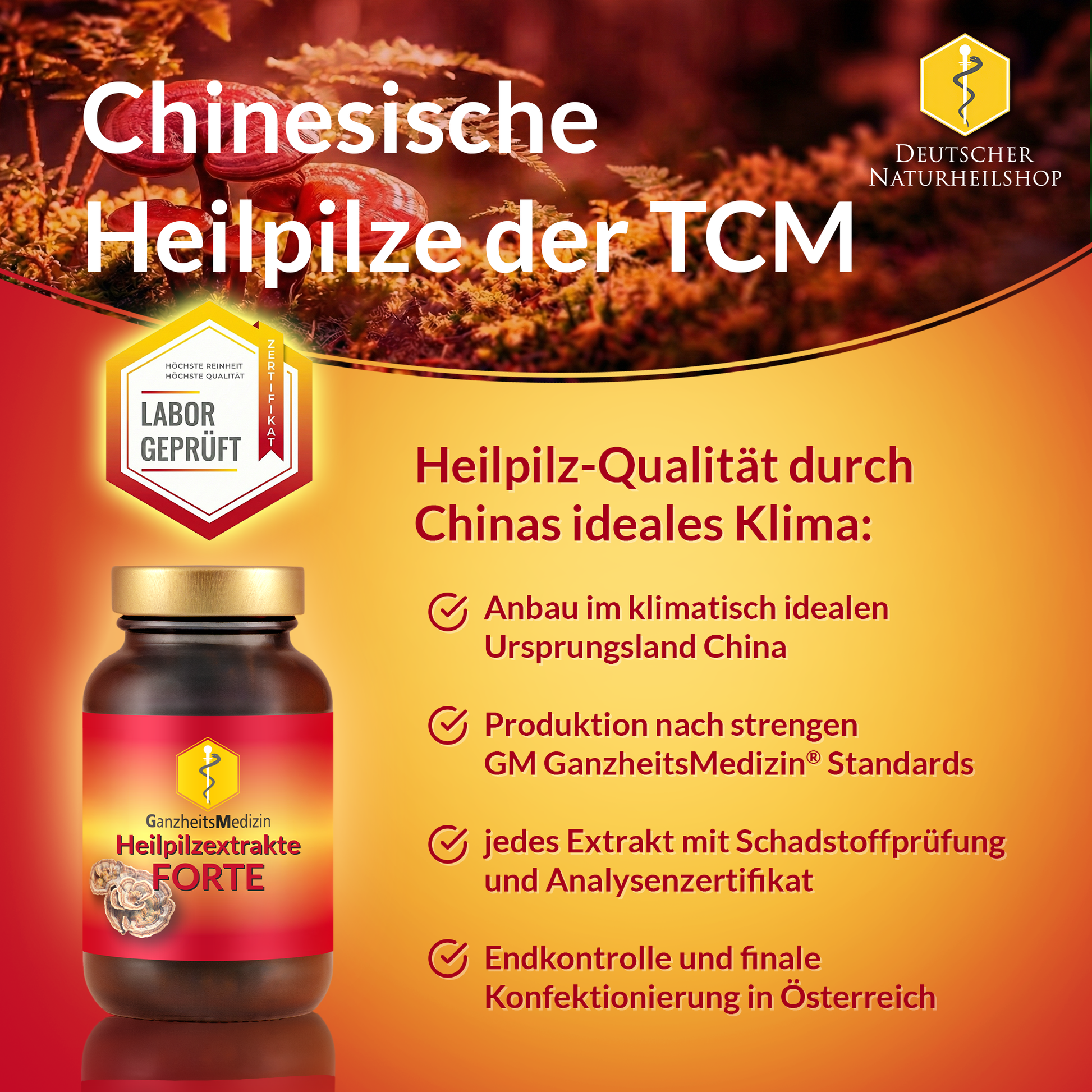 Hochwertiger Reishi-Extrakt (Ling Zhi), der "Pilz der Unsterblichkeit" aus der traditionellen chinesischen Medizin in veganen Kapseln.