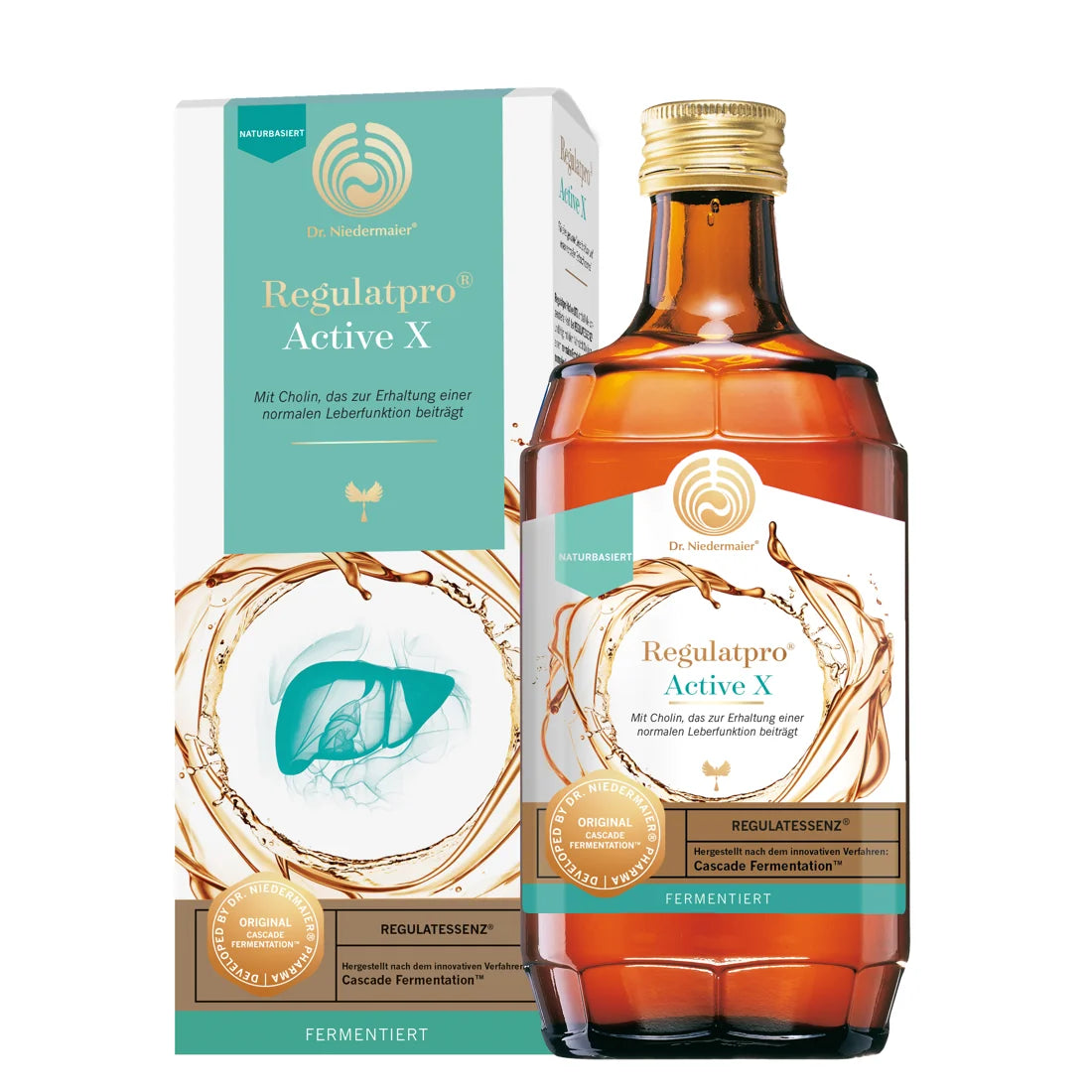 Aktiv entlasten – natürlich unterstützen! Regulatpro® Active X von Dr. Niedermaier vereint kaskadenfermentierte Regulatessenz® mit Cholin, B-Vitaminen, Selen, Zink und sechs speziell ausgewählten Pflanzenextrakten. Ein flüssiges Nahrungsergänzungsmittel zur Erhaltung einer normalen Leberfunktion und gesunden Fettstoffwechsels – für alle, die ihren Körper bei Entgiftung und Stoffwechsel unterstützen möchten.