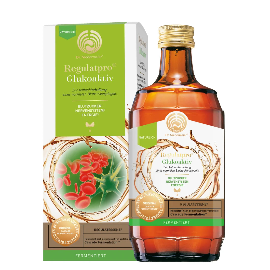 Balance im Stoffwechsel! Regulatpro® Glukoaktiv von Dr. Niedermaier vereint kaskadenfermentierte Regulatessenz® mit dem Spurenelement Chrom, hochwertigen Pflanzenextrakten sowie Vitaminen und Mineralstoffen. Ein flüssiges Nahrungsergänzungsmittel zur Unterstützung eines normalen Blutzuckerspiegels – für alle, die ihren Kohlenhydrat-Stoffwechsel aktiv begleiten möchten.