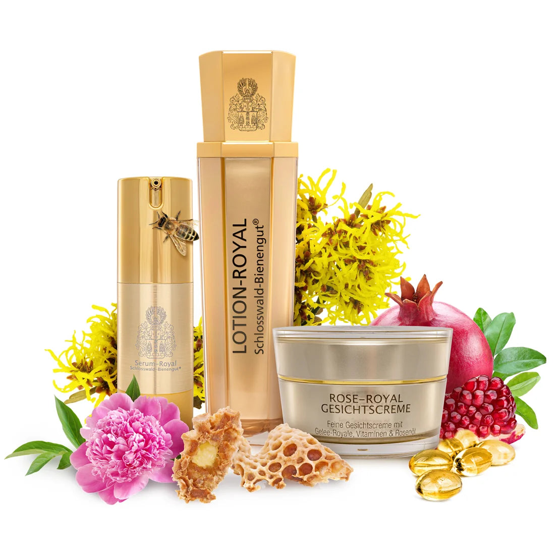 Jung + Schön Beauty-Set: Serum-Royal mit Bienengift, Rose-Royal Gesichtscreme und Lotion-Royal – WOW-Effekt von Kopf bis Fuß.