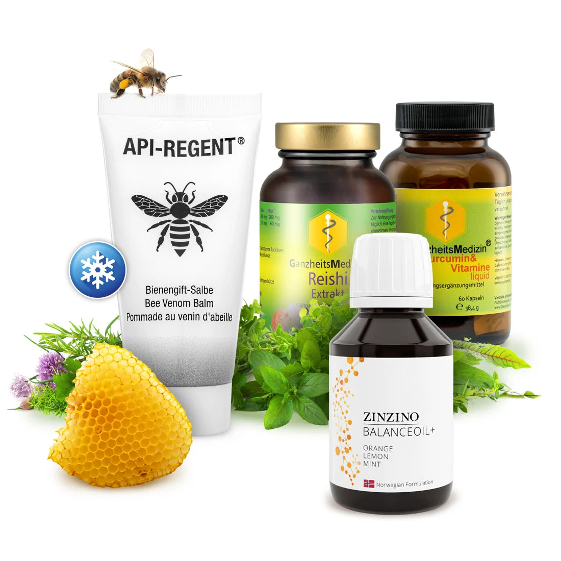Perfekt kombiniertes Anti-Entzündungs-Set mit Bienengift-Salbe, Curcumin, Reishi und Omega-3 für ganzheitliche Unterstützung.