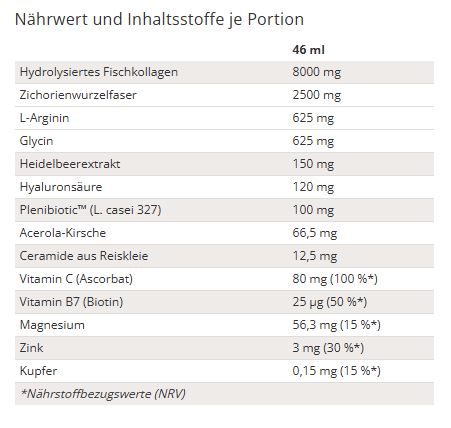 Wasser, Meereskollagen-Pulver (Kabeljau, Schellfisch, Seelachs) (Fisch), Zichorienwurzelfaser, Säureregulator (Glucono-delta-Lacton, Citronensäure), L-Arginin, Glycin, Magnesiumcitrat, Aroma, Heidelbeerextrakt, Hyaluronsäure, Konzentrat aus schwarzer Karotte, Lactobacillus casei subsp. casei 327, Vitamin C (Natriumascorbat), Extrakt aus Acerola-Kirsche, Konservierungsstoff (Kaliumsorbat), Ceramide aus Reiskleie, Süßungsmittel (Steviolglycoside aus Stevia), Zinksulfat, Kupfercitrat, Vitamin B7 (Biotin).